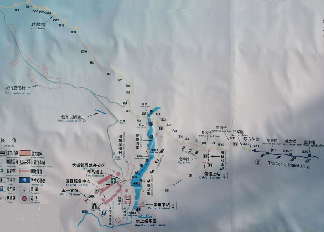 以水庫(kù)為界,以東的部分長(zhǎng)城為東段長(zhǎng)城,以西的部分為西段長(zhǎng)城,徒步登上司馬臺(tái)長(zhǎng)城東段第一個(gè)敵樓東一樓,在山下望司馬臺(tái)長(zhǎng)城,只見(jiàn)它背倚藍(lán)天,橫亙東西,野云悠悠,極高極險(xiǎn)。其山勢(shì)猶如人的手指并攏,呈雙向階梯狀。若從西面登上長(zhǎng)城,側(cè)向看去,唯有一峰在上,仿佛只要奮力爬上,便可居高臨下。但一旦登上第一個(gè)峰頂?shù)臄硺,轉(zhuǎn)身東望,卻又有一峰逼面。當(dāng)?shù)巧系诙䝼(gè)山頭的敵樓,仰頭東望,還有更高一峰在上;而低頭下望,只見(jiàn)第一個(gè)山頭上的敵樓全被掩住,真?zhèn)是“前不見(jiàn)古人,后不見(jiàn)來(lái)者!钡巧系谒膫(gè)敵樓,眼下開(kāi)闊起來(lái),遠(yuǎn)處的村莊冒著溫馨的炊煙,顯得恬靜、悠然。