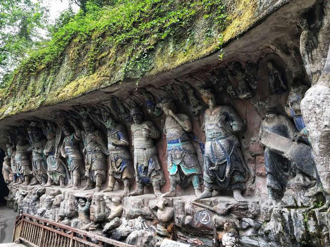 大足石刻分布于該縣西南、西北和東北的扇區(qū),共23處。較集中的有寶頂山、北山等19處。其中以寶頂山摩崖造像規(guī)模最大,造像最精美。除佛像和道教造像外,也有儒、佛、道同在一龕窟中的三教造像,而以佛教造像所占比例最大。