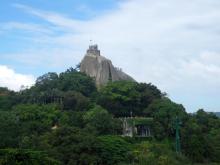 俗稱“巖仔山”,別名“晃巖”,相傳鄭成功來到晃巖,看到這里的景色勝過日本的日光山,便把“晃”字拆開,稱之為“日光巖”。日光巖游覽區(qū)由日光巖和琴園兩個部分組成。日光巖聳峙于鼓浪嶼中部偏南,是由兩塊巨石一豎一橫相倚而立,成為龍頭山的頂峰,海拔92.7米,為鼓浪嶼最高峰。日光巖寺,俗稱“一片瓦”,實際是一個天然石洞,以一巨石為頂,后依山形地勢建起寺廟的,具體時間是明朝正德年間萬歷十四年。日光巖寺屢毀屢建,清同治年間,建圓明殿,祀彌勒,并在廟前建一八角亭,上掛“日光寺”匾。解放后,圓明殿改為念佛堂,大雄寶殿是民國十六年(1917年)年建的。