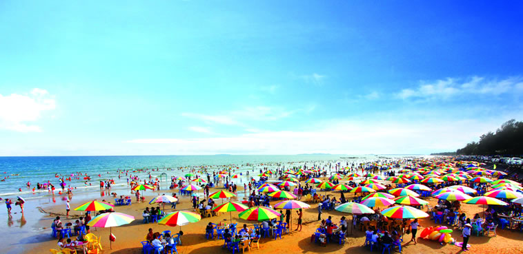 金灘,位于京族萬尾島的南邊,全長13公里,與越南的風(fēng)景名勝區(qū)萬柱島隔海相望。金灘沙細(xì)、坡緩、水清、浪平,且無海藻、無鯊魚、無污染。沙灘由海岸緩緩斜入海中,是集陽光、沙灘、海水于一身的天然“三·S”海濱浴場。岸上有20多公里長的椰樹、木麻黃觀光林帶。金灘空氣氧離子含量是內(nèi)陸城市的500~1000倍,最高氣溫33℃、最低氣溫6℃,年平均氣溫在20℃~23℃之間。