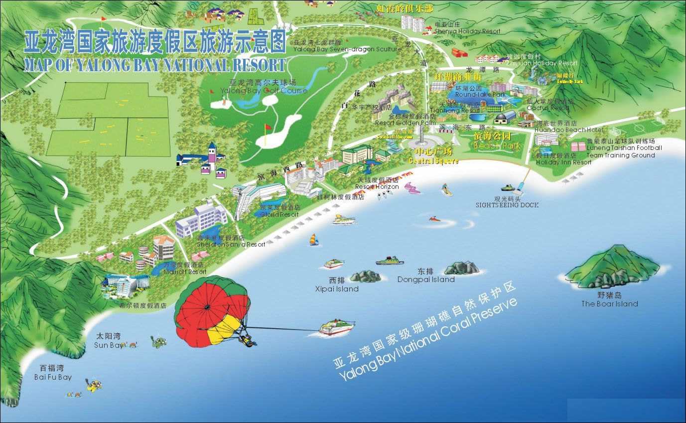 這里三面青山相擁,南面月牙型向大海敞開。除陽光、海水、沙灘俱佳外,尚有奇石、怪灘、田園風(fēng)光構(gòu)成了各具特色的風(fēng)景。錦母角、亞龍角激浪拍崖,怪石嶙峋,是攀崖探險(xiǎn)活動的良好場所。海面上以野豬島為中心,南有東洲島、西洲島,西有東排、西排,可開展多種水上運(yùn)動。亞龍灣中心廣場有高達(dá)27米的圖騰柱,圍繞圖騰柱是三圈反映中國古代神話傳說和文化的雕塑群。廣場上,四個(gè)白色風(fēng)帆式的尖頂帳篷,給具有古老文化意蘊(yùn)的廣場增添了現(xiàn)代氣息。