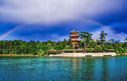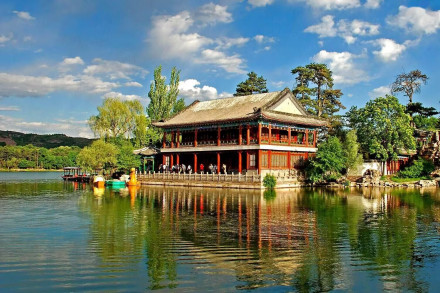 湖泊區(qū):苑景區(qū)的精華基本上在湖泊區(qū),康熙曾夸耀說(shuō),“天然風(fēng)景勝西湖”。由于洲島錯(cuò)落,湖面被長(zhǎng)堤和洲島分割成5個(gè)湖,各湖之間又有橋相通,兩岸綠樹(shù)成蔭,山莊主要的風(fēng)景建筑又都散落在湖區(qū)的周圍,因此顯得曲折有致,秀麗多姿。湖泊區(qū)位于山莊東南,面積49.6萬(wàn)平方米。有大小湖泊八處,即西湖、澄湖、如意泅、上湖、下湖、銀湖、鏡湖及半月湖,統(tǒng)稱為塞湖。 湖區(qū)的風(fēng)景建筑大多是仿照江南的名勝建造的,如“煙雨樓”,是模仿浙江嘉興南湖煙雨樓的形狀修的。金山島的布局仿自江蘇鎮(zhèn)江金山。湖中的兩個(gè)島分別有兩組建筑,一組叫“如意洲”,一組叫“月色江聲”!叭缫庵蕖鄙嫌屑偕、涼亭、殿堂、廟宇、水池等建筑,布局巧妙,是風(fēng)景區(qū)的中心。“月色江聲”是由一座精致的四合院和幾座亭、堂組成。每當(dāng)月上東山的夜晚,蛟潔的月光,映照著平靜的湖水,山莊內(nèi)萬(wàn)籟俱寂,只有湖水在輕拍堤岸,發(fā)出悅耳的聲音,“月色江聲”的題名便是由此而來(lái)。湖泊區(qū)集南方園林之秀和北方園林之雄,將江南園林的景觀移植到塞外。區(qū)內(nèi)湖泊總稱“塞湖”,總面積57公頃。