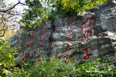 在一塊塊自然山石上,鐫刻著當(dāng)代書法名家的作品,因名“墨香小徑”。踏入這條小徑,便會(huì)為104塊天然石上的書法瑰寶所陶醉。字因石愈顯其秀,石因字更顯其神。真草隸篆,形體各異;顏肌柳骨,風(fēng)韻不同。啟功、沈鵬、李苦禪、沙孟海、林散之、武中奇、范曾、舒同、李淑一、蕭嫻、李一氓、郭化若等位大師的真跡,為勝境錦上添花。