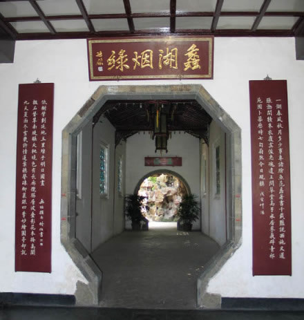 這是一幢頗具江南地方特色的“石庫(kù)門(mén)”建筑,原系“漁莊”大門(mén),經(jīng)數(shù)次改筑,辟為蠡園正門(mén)。它面闊三間,進(jìn)深九界,雙坡小青瓦屋頂,方磚貼面,下為金山石墻裙,門(mén)額為金色“蠡園”二字。門(mén)廳后墻又開(kāi)八角形門(mén)洞,接出暗廊,廊端又開(kāi)月洞,由此入園。