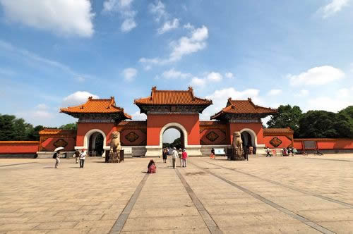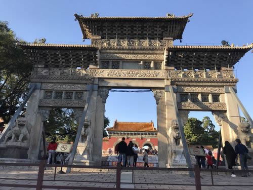 過了石橋不遠處就是石牌坊,位于通往正紅門的中間路段,其上雕刻生動形象,是清代雕刻的珍品。過了石牌坊,就是正紅門了,是陵寢的大門,兩側(cè)院落東為更衣亭西為宰牲亭。