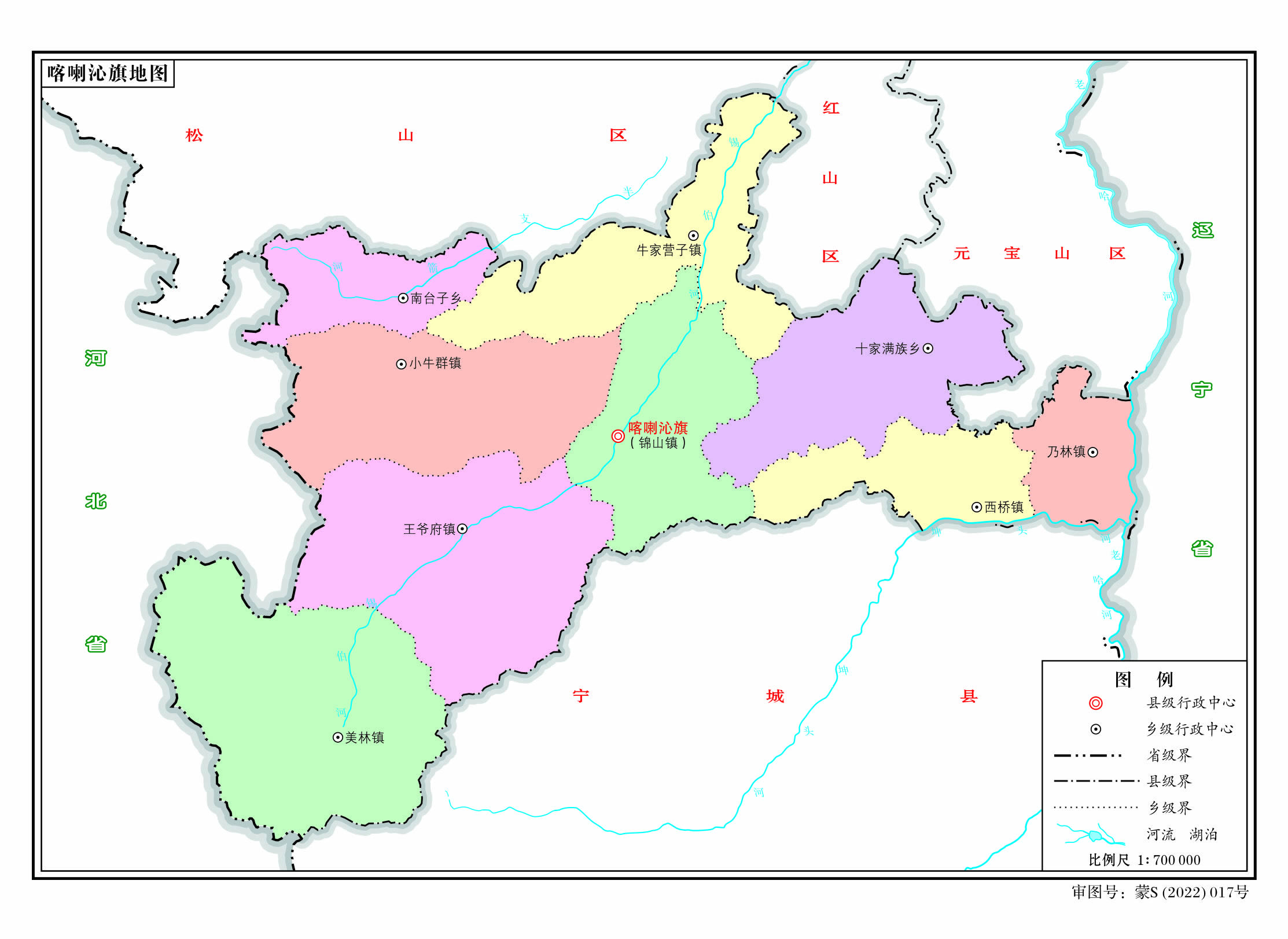 喀喇沁旗轄6個(gè)鎮(zhèn)、11個(gè)鄉(xiāng)(其中1個(gè)民族鄉(xiāng)),乃林果樹農(nóng)場(chǎng)、馬鞍山羊場(chǎng):