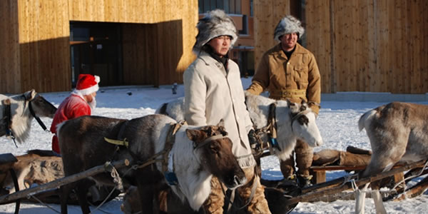 敖 生態(tài)環(huán)境 這里是森林與草原的界線,大興安嶺和呼倫貝爾大草原在這里交匯,一邊是草原、河流,一邊是森林、山崗,空氣新鮮,野味十足,當?shù)厝税氘斦娴恼f"這地方絕對沒有污染,連蒼蠅、蚊子都是綠食食品"。 國家給敖魯古雅鄉(xiāng)人建立了定居地,但馴鹿只能生活在森林里,所以除了在定居點的部分村民,密林中還散布著五個馴鹿站,最遠的在150公里。過去,敖魯古雅人養(yǎng)馴鹿只是作為運輸工具,一頭馴鹿可以負重35公斤左右,每小時可以行走5公里,1964年,取得了割鹿茸成功。現(xiàn)在,馴鹿已經(jīng)不大用來運輸了,而成了當?shù)厝说闹饕?jīng)濟來源,中國唯一的這群馴鹿大約只有10000只左右了。 敖鄉(xiāng)民俗村 敖魯古雅鄂溫克民俗村位于根河市西郊,南臨S301國道,交通十分便利。民俗村總建筑面積58,700平方米,是集大中型會議、休閑度假、民俗展示、娛樂為一體的綜合性旅游度假村,是一處自然——人文旅游 景觀。 民俗村依托森林、河流,鄂溫克獵民的民俗民風,推出一系列具有地方特色的旅游活動項目:主要有森林觀光、探險、模擬狩獵;觀民族宗教、歌舞、民俗表演;品嘗民族風味餐、參觀敖鄉(xiāng)新居、訪獵民等活動;村內(nèi)建有木質(zhì)別墅式的游客服務中心,民俗文化博物館、民俗表演平臺、表演廳和餐廳、反映鄂溫克獵民歷史的圖騰廣場、有四十、五十、六十年代不同的撮羅子,有上山索道車、木橋和四處風格獨特的獵民點;還有民俗表演隊和馴鹿車穿行其中,可對敖魯古雅鄂溫克獵民的歷史、文化、宗教、習俗進行了充分的展示。 敖魯古雅鄉(xiāng)距離我國最北端的漠河縣約一百公里左右的路程,位于大興安嶺深處的滿歸林區(qū)。這里氣候十分寒冷,記者走在蜿蜒的山路上,腳下的積雪發(fā)出“咯吱咯吱”的脆響,眼前已是呵氣成冰,身上的棉襖凍得硬梆梆的。隨行的鄉(xiāng)黨委書記鮑玉林說:“現(xiàn)在大約是零下30攝氏度,你們趕上好時候了,往年這個時候得有零下五十度,外面到處冒白煙。” 敖魯古雅鄉(xiāng)有一條主干道,長不過二三百米。道兩邊是整齊的幾排木刻楞房和磚瓦房,象征著主人的富裕程度。敖鄉(xiāng)雖小,卻擁有自己的博物館、學校、文化站和小商店。春節(jié)雖過,但喜慶氣氛尚濃,白雪映襯下,墻上的大紅對聯(lián)分外惹眼。 敖鄉(xiāng)生活著近500人,其中鄂溫克人大約有230人。他們現(xiàn)在已經(jīng)是獵民定居后的第三代了。在離此50到100多公里的山林中,還有四個獵民點,生活著30多名習慣于打獵和在山上飼養(yǎng)馴鹿的老獵民們。