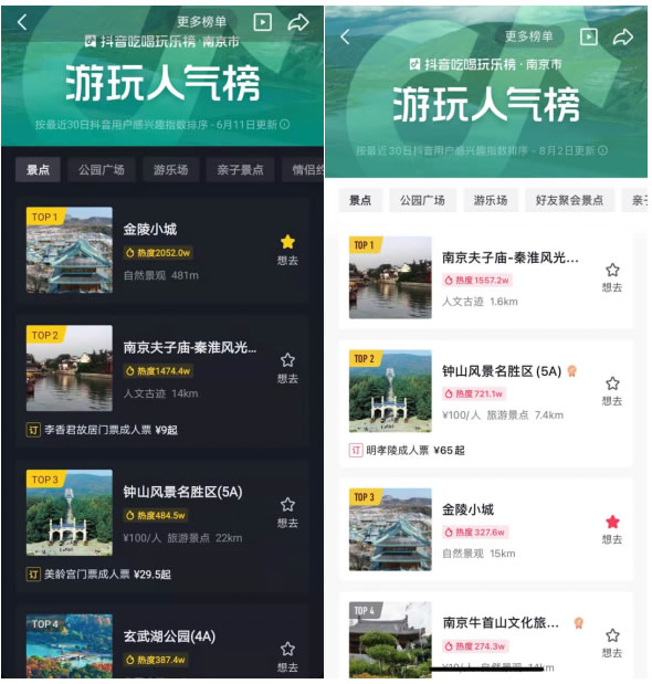 金陵小城的火爆,不僅體現(xiàn)在游客好評如潮,各大平臺的數(shù)據(jù)更能直觀的說明景區(qū)熱度。據(jù)了解,金陵小城開啟試運營后便迅速成為抖音新晉網(wǎng)紅景點,在6月上旬迅速躥升為南京市游玩人氣榜TOP1,7月下旬仍然位居TOP3,推薦度高達96%。