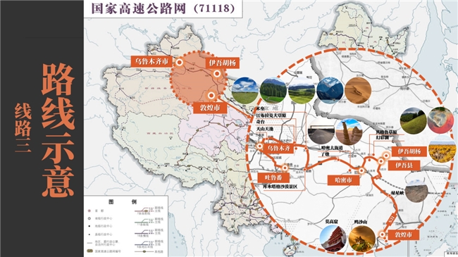 線路三“千里西域行”則以“千年敦煌·萬(wàn)年胡楊”——烏魯木齊至敦煌絲路星辰探索之旅為主題,該線路亮點(diǎn)為敦煌莫高窟、鳴沙山、伊吾胡楊、北疆自然風(fēng)景觀光和民族文化體驗(yàn)等。全程路線大約2202.6公里