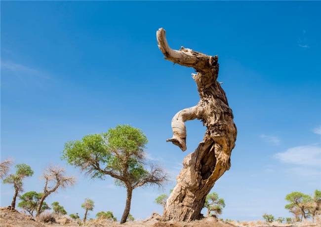 九千年胡楊,這里胡楊樹(shù)形也同樣奇特,有的胡楊猶如一頭大象,象鼻朝下吸水,象背馱著元寶自遠(yuǎn)處而來(lái),為游客帶來(lái)吉祥和財(cái)富;有的胡楊春萌新芽,夏葉婆娑,秋金滿地,冬蘊(yùn)傲骨;有的胡楊就像古代的帝王莊嚴(yán)的祭祀著天地的生靈,祈求一方祥和,護(hù)佑一方安寧。