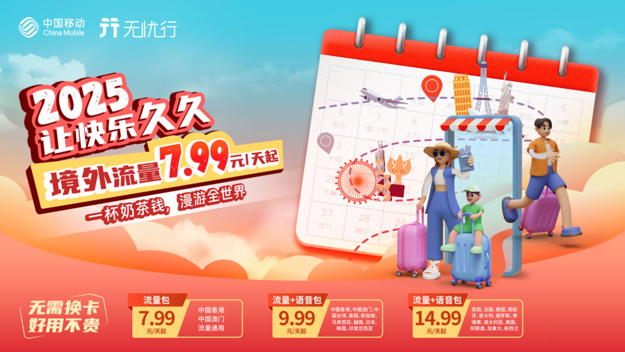 中國移動(dòng)“國漫.99”系列覆蓋了中國香港、中國澳門、中國臺(tái)灣、新馬泰、越南、日本、韓國、俄羅斯、歐洲五國、柬埔寨、美國、新西蘭等20個(gè)熱門國家和地區(qū)。用戶可根據(jù)自身實(shí)際出行天數(shù)或區(qū)域選擇對(duì)應(yīng)流量包,最低9.99元/天即可暢享語音+流量無憂組合,不論是短期旅游或是長(zhǎng)期出差、探親,皆能得到滿足。產(chǎn)品落地激活后,上網(wǎng)流量均是高速流量,不受日流量閾值限制,境外旅游也能絲滑“網(wǎng)上沖浪”!