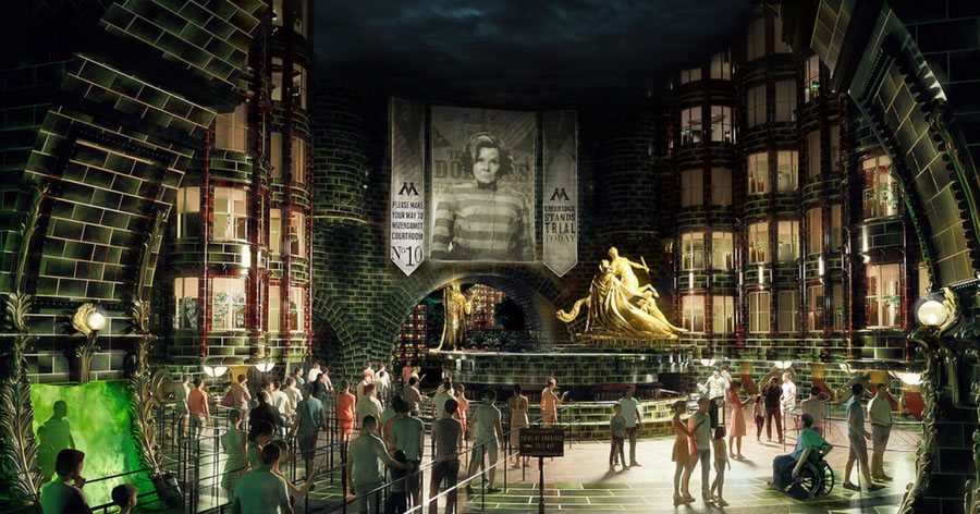 第二個(gè)矚目的新園區(qū)是哈利波特魔法世界(The Wizarding World of Harry Potter)的擴(kuò)建園區(qū):并命名為魔法部之謎(Ministry of Magic),項(xiàng)目首次跳出了一期園區(qū)霍格沃茨與對(duì)角巷,深入《神奇動(dòng)物》系列中1920年代的巴黎魔法部。喬治卡爾森(George Carlson)設(shè)計(jì),英國(guó)全息視覺公司Holovis打造的 “魔法部時(shí)空電梯(Ministry Time-Turner Elevator)”將無(wú)縫穿梭紐約、倫敦與巴黎,采用4D投影實(shí)時(shí)渲染窗外街景,形成極具震撼力的沉浸式魔法場(chǎng)景體驗(yàn)。而 “默默然防御訓(xùn)練(Obscurial Escape)” 多人射擊游戲,需用魔杖擊退熱感應(yīng)投影的黑暗生物,積分實(shí)時(shí)影響勛章等級(jí),將游客互動(dòng)參與性帶入全新的高度。