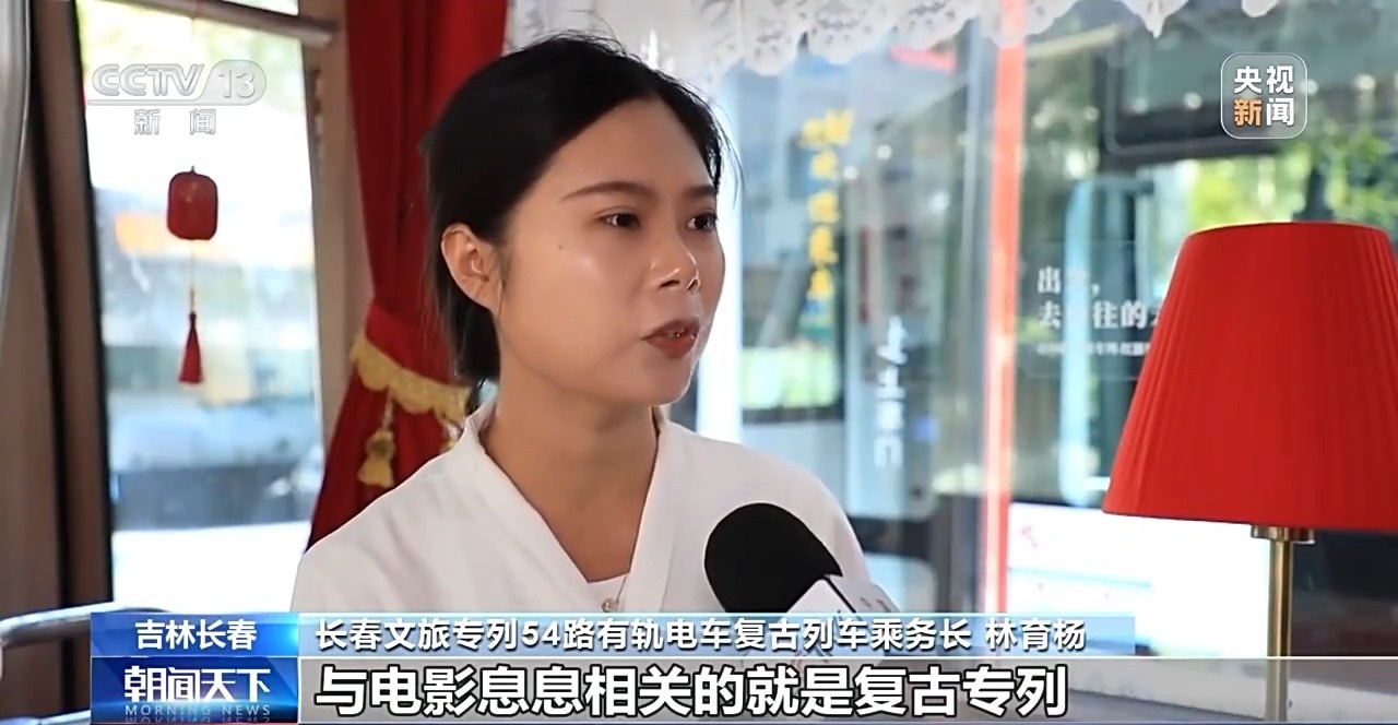 長(zhǎng)春文旅專列54路有軌電車復(fù)古列車乘務(wù)長(zhǎng) 林育楊:與電影息息相關(guān)的就是復(fù)古專列。它的起始站就是長(zhǎng)影舊址博物館,途經(jīng)東風(fēng)大街、創(chuàng)業(yè)大街、南陽路,都是熱播劇的取景地。