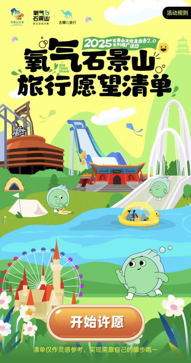 在“去哪兒”旅行APP上線“氧氣石景山”文旅專題頁,不僅整合酒店榜單、景區(qū)門票、優(yōu)質(zhì)攻略等核心文旅資源,更特別設(shè)置石景山區(qū)對(duì)口支援和協(xié)作地文旅產(chǎn)品版塊,實(shí)現(xiàn)“石景山推廣+支援地區(qū)助銷”雙重價(jià)值。同步推出的“旅行打卡愿望清單”H5,線上用戶可點(diǎn)亮自己的石景山旅游心愿,生成專屬旅行愿望清單;在高校路演活動(dòng)中,大學(xué)生可分享H5到社交媒體作為參與活動(dòng)的入場(chǎng)券——既為高;顒(dòng)預(yù)熱,更成為高校路演入場(chǎng)憑證,串聯(lián)起“線上互動(dòng)-線下參與”的閉環(huán)。