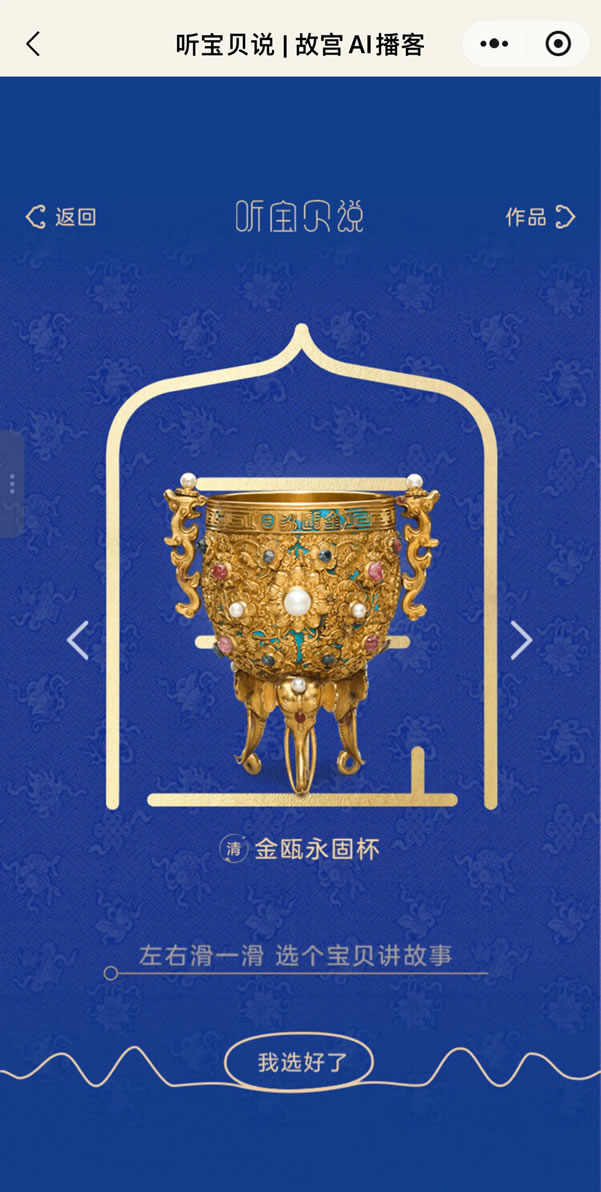 在故宮博物院建院100周年的尾聲,“聽寶貝說”為家長和孩子們呈上一份聲音禮物,通過個(gè)性化生成的AI播客,將文物故事轉(zhuǎn)化為視聽語言。那些來自千百年前的珍貴文物,仿佛穿越時(shí)空,來到孩子身邊,開始一場(chǎng)“寶貝”與“寶貝”間的聲音互動(dòng)。部分文物來自故宮博物院常設(shè)展館,聽完還可以線下打卡,近距離欣賞文物“寶貝”。