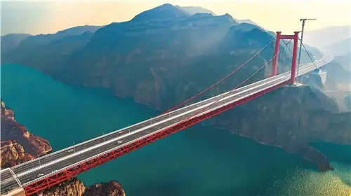 蜿蜒如龍的濟新高速,長度約48公里,點睛之筆就是這座黃河三峽大橋。長1688.5米、主跨度555米,這座“咽喉工程”不僅是我省跨徑最大的橋梁,也在世界工程史上留下河南地標(biāo)。