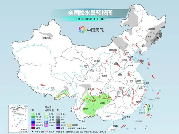 這次冷空氣南下過程中,帶來的雨雪天氣并不多,主要在內(nèi)蒙古中東部、東北一帶。監(jiān)測顯示,9日8時至10日6時,內(nèi)蒙古中東部、遼寧、吉林、黑龍江東部、河北北部、山西北部等地出現(xiàn)小到中雪或雨夾雪,內(nèi)蒙古東南部、遼寧中東部、吉林東南部部分地區(qū)現(xiàn)大到暴雪。