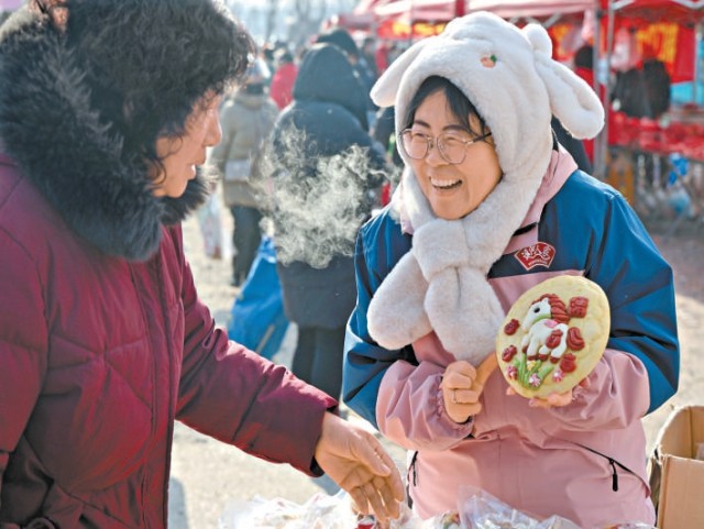 非遺傳承人張鑫瑩(右)在大集上為顧客展示馬年花饃。本報記者 白繼開攝