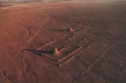 西夏陵陵邑遺址是一個(gè)平面布局呈長(zhǎng)方形的建筑群體,座北朝南,方向南偏東20度。