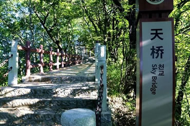 云霧天橋是由泥土和山石天然堆砌生就而成的。它坐落在云霧山鬼谷嶺南麓一條山脊上,地處三天門到四天門之間。這里海拔近2000米,在天際的白云中飄浮,所以稱它為云霧天橋。此橋其實(shí)就是一條短短的山脊,長(zhǎng)約20余米,寬不足1米,僅容一人通過。