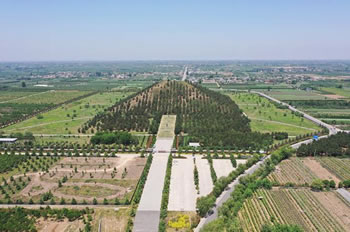 上述與今測(cè)量數(shù)字基本相符。總占地面積計(jì)為56878.25平方米,封土體積848592.92立方米。陵園四周呈方形,平頂,上小下大,形如覆斗,顯得莊嚴(yán)穩(wěn)重。