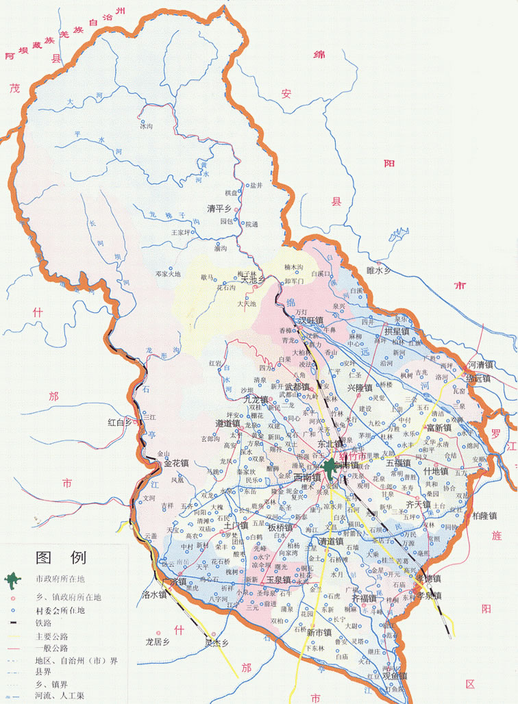 鎮(zhèn):劍南鎮(zhèn)、玉泉鎮(zhèn)、什地鎮(zhèn)、富新鎮(zhèn)、孝德鎮(zhèn)、新市鎮(zhèn)、板橋鎮(zhèn)、興隆鎮(zhèn)、金花鎮(zhèn)、廣濟(jì)鎮(zhèn)、土門鎮(zhèn)、遵道鎮(zhèn)、綿遠(yuǎn)鎮(zhèn)、拱星鎮(zhèn)、九龍鎮(zhèn)、漢旺鎮(zhèn)、齊天鎮(zhèn)、西南鎮(zhèn)、東北鎮(zhèn)