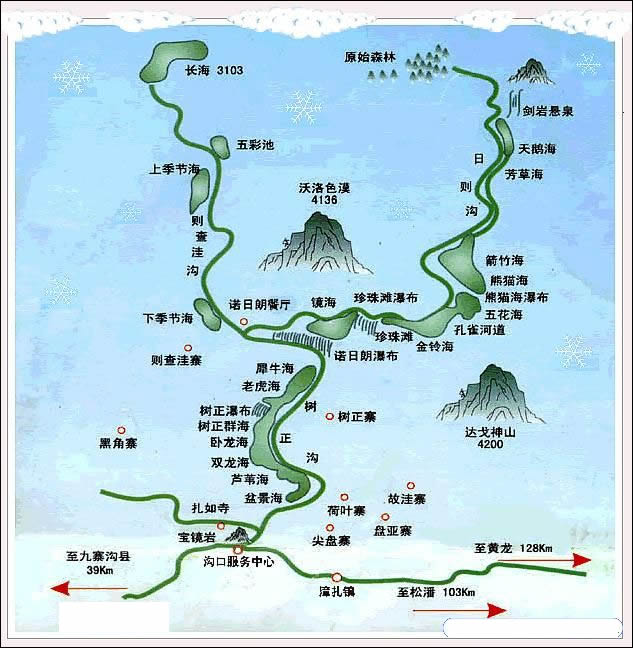 九寨溝國家級自然保護(hù)區(qū)地勢南高北低,山谷深切,高差懸殊,區(qū)北緣九寨溝口海拔僅2000米,中部峰嶺均在4000米以上,南緣達(dá)4500米以上,主溝長30多千米。峰頂和兩側(cè)山峰基本終年積雪。九寨溝地處青藏高原向四川盆地過渡地帶,地質(zhì)背景復(fù)雜,碳酸鹽分布廣泛,褶皺斷裂發(fā)育,新構(gòu)造運(yùn)動強(qiáng)烈,地殼抬升幅度大,多種營力交錯復(fù)合,造就了多種多樣的地貌,發(fā)育了大規(guī)模喀斯特作用的鈣化沉積,以植物喀斯特鈣華沉積為主導(dǎo),形成九寨溝艷麗典雅的群湖,奔瀉湍急的溪流,飛珠濺玉的瀑群,古穆幽深的林莽,連綿起伏的雪峰。