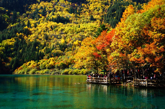 浪漫的秋風(fēng)也吹來了九寨溝最為燦爛的時節(jié)。山林暈染成色,除了綠色以外,還呈現(xiàn)出金黃、火紅等色彩,五彩繽紛,倒映在明麗的湖水中,湖山同色,湖水也斑斕似錦了,一時間竟然不能分清哪里是山哪里是水,十分迷人。