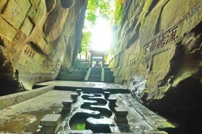 仿照東晉書法家王羲之蘭亭集會(huì)流觴曲水的意境,黃庭堅(jiān)利用這峽谷的地形和天然泉水,修建了900多年來遐邇聞名的流杯池。保持其天然的山水景致是文人造園崇尚自然的山水理念,流杯池內(nèi),從谷底到崖壁頂,蜿蜒臺(tái)階而上,幾個(gè)平臺(tái)錯(cuò)落其間,時(shí)而寬敞平緩,時(shí)而臨崖高懸,這樣的美景是黃庭堅(jiān)在領(lǐng)會(huì)自然美的規(guī)律上進(jìn)行的藝術(shù)再創(chuàng)造。