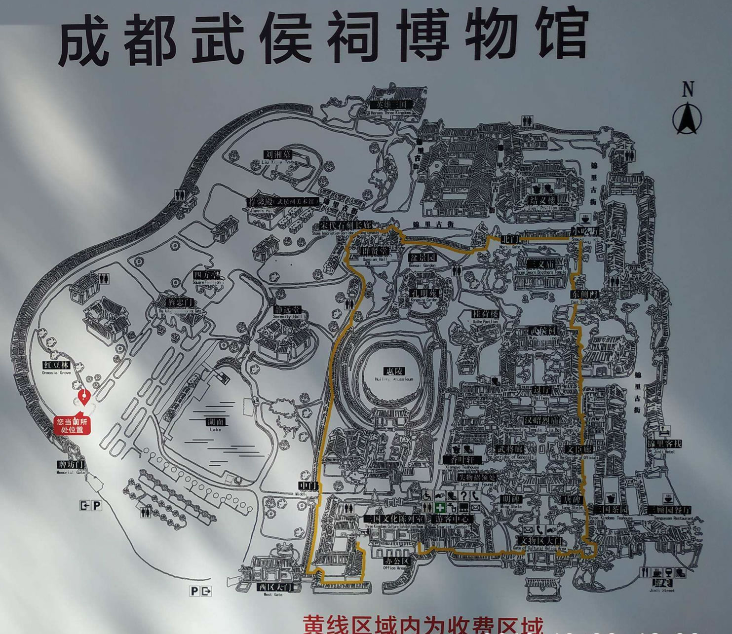成都武侯祠博物館現(xiàn)分為三國歷史遺跡區(qū)(文物區(qū))、西區(qū)(三國文化體驗區(qū))、錦里民俗區(qū)(錦里)三大板塊,面積15萬平方米。整個武侯祠坐北朝南,占地面積五十六畝(37000平方米),祠內(nèi)翠柏森森,殿宇重重,布局嚴謹,莊嚴肅穆。成都武侯祠主體建筑大門,二門,劉備殿,過廳,武侯祠五重,嚴格排列在從南到北的一條中軸線上,西側(cè)是劉備陵園及其建筑。二門至劉備殿與東西殿、過廳至諸葛亮殿與東西兩廂房,形成兩組四合建筑結(jié)構(gòu)。軸線建筑兩側(cè)配有園林景點和附屬建筑。 跨進漢昭烈廟,從大門到二門之間可見六通石碑聳立一道路。