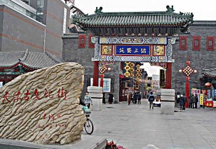天津古文化街于一九八六年元旦建成開業(yè),整體建筑為仿清民間式建筑風(fēng)格,天后宮(媽祖廟)位于全街的中心。全街近百家店堂,有經(jīng)營天津地方特色的楊柳青年畫的楊柳青畫社,經(jīng)營泥人彩塑的泥人張彩塑工藝品經(jīng)營部,有經(jīng)營文房四寶,名人字畫的四寶堂,春在堂,有經(jīng)營文物古玩的文物公司萃文齋門市部,還有經(jīng)營全國各地的景泰藍(lán),雙面繡,牙玉雕,藝術(shù)陶瓷,中西樂器金銀飾品等上萬種名優(yōu)工藝品的幾十家店堂,各種商品貨真價實,物美價廉,商家以質(zhì)量和信譽(yù)吸引中外游客。