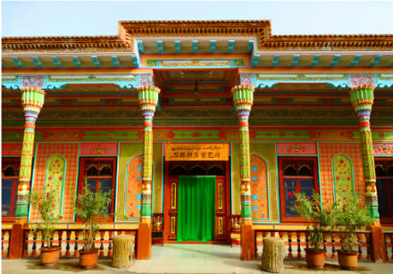 這座民族特色濃郁,極具刀郎人建筑風格的宴藝廳就是刀郎部落招待貴賓及聚會、就餐、欣賞刀郎歌舞的場所。餐廳裝飾工藝主要為刀郎人傳統(tǒng)的石膏雕、木雕和磚雕。墻面上色彩艷麗,植物花卉圖案的是石膏雕,回廊上的木柱子為木雕,據說這樣的一根柱子需要兩個工匠花一個月時間才可完成。屋檐最上面一層為磚雕。刀郎部落宴藝廳可容納300人就餐,在品嘗地道刀郎美味的同時還可欣賞刀郎歌舞表演。