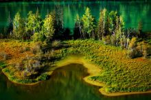 變色湖位于喀納斯湖中央。春夏時節(jié),湖水會隨著季節(jié)和天氣的變化而變換顏色。從每年的四五月間開化到11月冰雪封湖,湖水在不同的季節(jié)呈現(xiàn)出不同的色彩。5月的湖水,冰雪消融,湖水幽暗,呈青灰色;到了6月,湖水隨周山的植物泛綠,呈淺綠或碧藍(lán)色;7月以后為洪水期,上游白湖的白色湖水大量補給,由碧綠色變成微帶藍(lán)綠的乳白色;到了8月湖水受降雨的影響,呈現(xiàn)出墨綠色;進入9、10月,湖水的補給明顯減少,周圍的植物色彩斑斕,一池翡翠色的湖水光彩奪目。