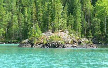越桔島在喀納斯湖湖心島旁,有一個伸入湖中的半島,島上的林下苔蘚層長滿了獨特的越桔灌叢,人們稱其為越桔島。