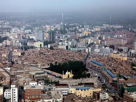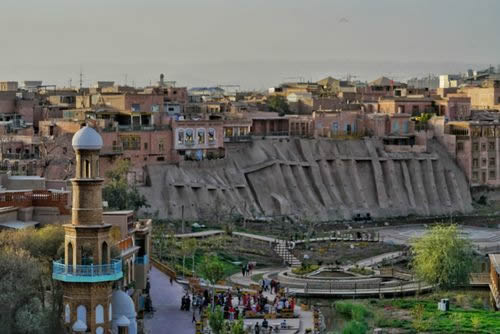 清朝自1760年在喀什噶爾設(shè)參贊大臣之后,作為天山以南的政治、經(jīng)濟(jì)、文化和交通中心,喀什噶爾城人口激增,舊城區(qū)居住不下,開始向今解放路以西拓展。1762年筑徠寧城,與舊城只隔不足1公里。到1839年,徠寧城與舊城之間的地帶已全建為民居,清朝駐喀什噶爾阿奇木伯克郡王祖赫爾。词窌兴Q“阿肯木伯克早敦”)主持了擴(kuò)城工程,將城西墻移至今尤木拉克協(xié)海爾路,與原徠寧城相連,在今老郵電局處新辟南門,稱“庫木代爾瓦扎”(沙門),南關(guān)一帶成為繁華的手工業(yè)區(qū),形成了以艾提尕大清真寺為中心的一座新城。