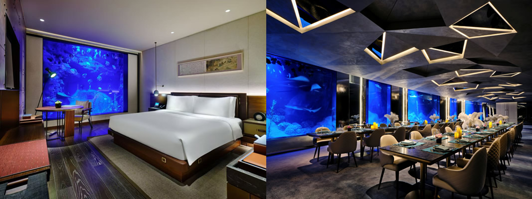 上海佘山世茂洲際酒店,地平線下88米的“建筑奇跡”,由世界知名設(shè)計師Martin Jochman團隊打造,將自然巖壁與現(xiàn)代設(shè)計完美融合。酒店330間客房與套房各具特色,包括巖壁景觀房與水下套房,帶來沉浸式住宿體驗。餐飲涵蓋現(xiàn)代感十足的“源咖啡”全日餐廳、綺麗獨特的彩豐樓中餐廳以及四周環(huán)繞水族館的“漁火”特色餐廳;酒吧與大堂吧將深坑景觀與自然美景相映成趣,讓賓客在自然奇境中享受別具一格的入住體驗。