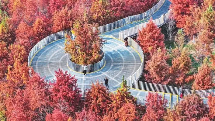 12月15日,漢口常青人才公園,大片火紅的杉樹林和空中觀景棧道完美適配,隨手一拍都是冬日美圖大片,成為市民熱門的打卡地。經(jīng)歷上一輪寒潮,武漢水杉、池杉、落羽杉齊刷刷變紅,紅杉進入最佳觀賞期。 楚天都市報極目新聞記者李輝攝