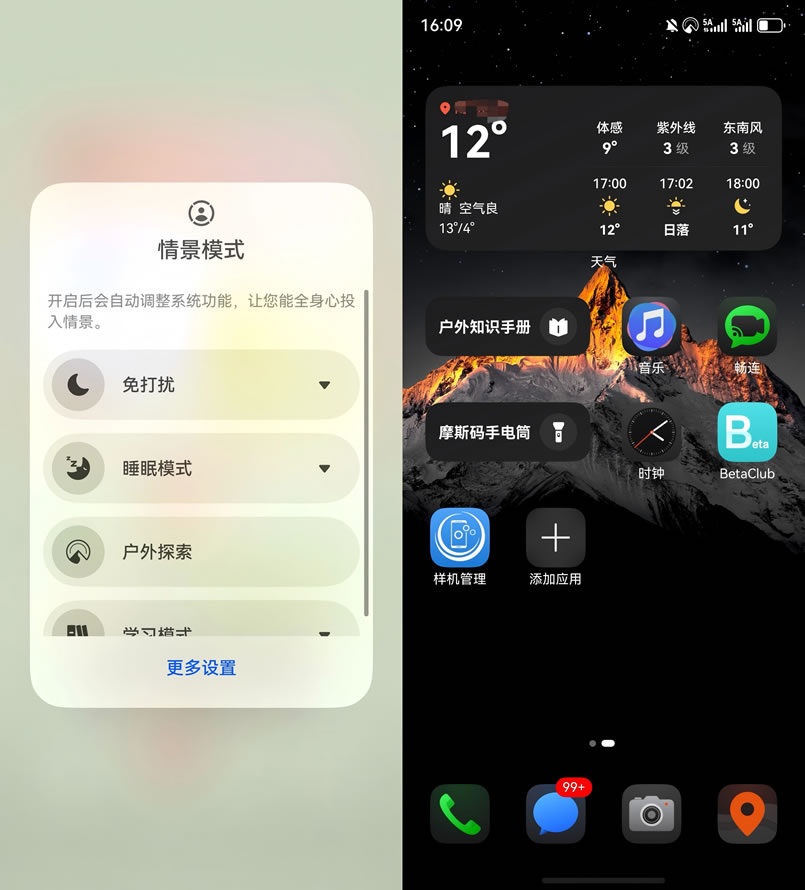 除此之外,我還留意到一個(gè)很貼心的設(shè)計(jì):開啟戶外探索模式后,桌面上的天氣時(shí)鐘組件會(huì)自動(dòng)切換成“戶外版”——字體變得粗大清晰。在戶外徒步中,只需瞥一眼屏幕,快速知曉時(shí)間、氣溫等。