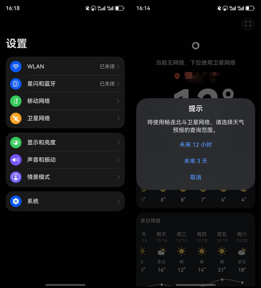 哪怕營(yíng)地完全沒有信號(hào),現(xiàn)在也不用慌。有網(wǎng)絡(luò)時(shí)提前在設(shè)置-衛(wèi)星網(wǎng)絡(luò)里打開“暢連北斗衛(wèi)星消息”后,我可以切換到衛(wèi)星網(wǎng)絡(luò)模式,能查看未來(lái)12小時(shí)、最長(zhǎng)3天的天氣數(shù)據(jù)。手里有這個(gè)戶外神器,再也不必?fù)?dān)心與世隔絕和天氣突變了。