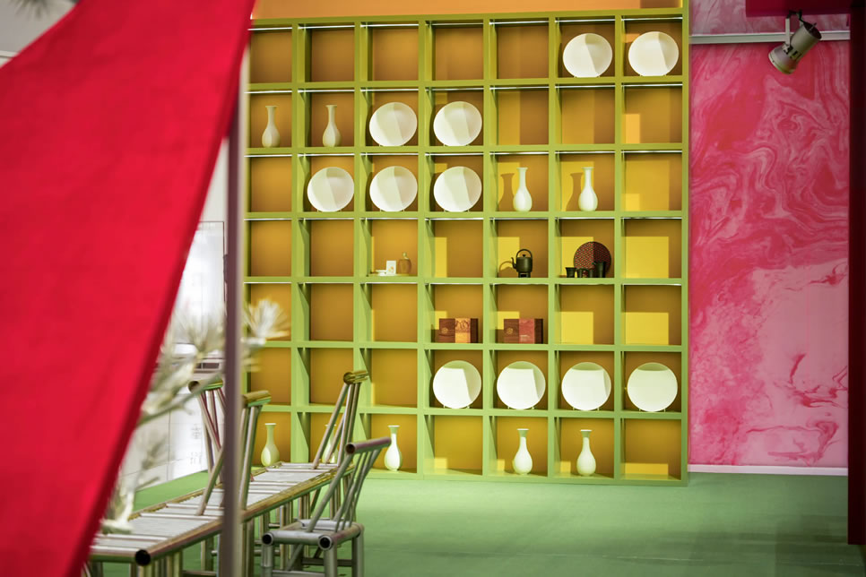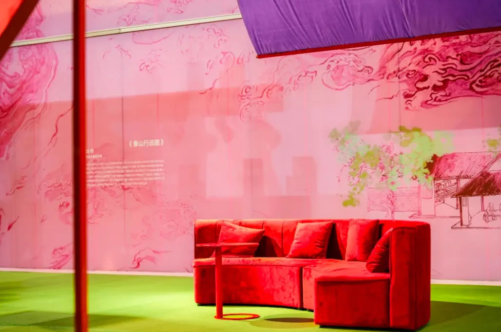 山水,并非遠行才可得見。書法水墨藝術家劉玥首展作品《春山行遠圖》以20米巨幅“山水開卷”,步入其中,與天地春意從容照面;紅色的帷幔落于銀色的松枝上,就像于山間松下靜謐的一隅,“幕下棲心”將是絕佳開年時尚大片的打卡處;松下銀椅,為你與摯友“漫敘往來”的相聚時刻營造出寧靜、松弛的氛圍;多寶閣中陳列著未經(jīng)雕琢的茶器素胚與場內(nèi)品牌萬仟堂,長沙尼依格羅酒店及tea'stone帶來的新春茶器,以“初芒蘊能”詮釋著未來的無限可能與新生力量。轉(zhuǎn)身與“蒔光種愿” 四方亭相遇。葫蘆門朝四方而開,寓意著納四方福祿,步入其中,與數(shù)字交互藝術家吳旭首展作品《無限福祿》體驗互動,跟隨指引揮動手勢,觸發(fā)粒子凝聚為動態(tài)“福”字,親手完成一場新春祈福儀式。我們把象征團圓與喜悅的紅色沙發(fā)打造“盞間聚暖”,如懷抱般圍合的布局作為“歸處”的隱喻。與家人團聚便是心歸處,這將是中國年最圓滿的意象。