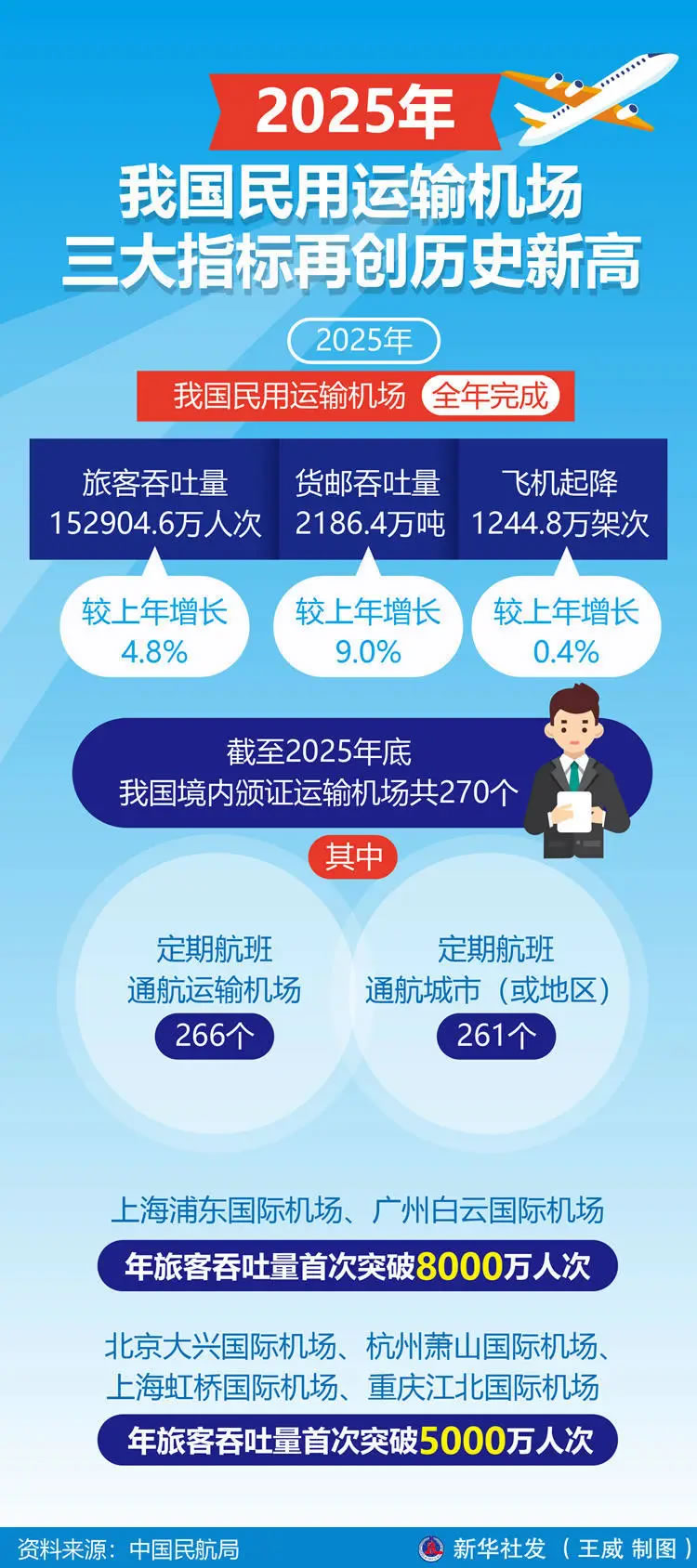 新華社北京2月26日電(記者王聿昊)記者26日從中國民航局獲悉,2025年,我國民用運輸機場三大主要生產(chǎn)指標再創(chuàng)歷史新高,全年完成旅客吞吐量152904.6萬人次、貨郵吞吐量2186.4萬噸、飛機起降1244.8萬架次,較上年分別增長4.8%、9.0%、0.4%。