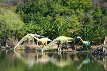 由“侏羅紀(jì)大瀑布”、“群龍對峙”、“腕龍相親”、“氣龍追逐”、“雙龍飲瀑”、“霸王龍窺獵”、“侏羅紀(jì)叢林”、“海棗之王”、“沙漠之林”等九大景觀真實再現(xiàn)了侏羅紀(jì)時代恐龍王國的生活場景,構(gòu)造出一個1億年前生氣勃勃、繁榮昌盛的侏羅紀(jì)世界,讓游客飽享一頓視覺大餐。