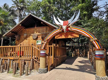 云南民族村景頗寨占地15畝,有寬敞大方的各式民居建筑和精美華麗的”山官房”。建筑形式集中表現(xiàn)了景頗族“干欄式”、“倒T型”等結(jié)構(gòu)特征和布局形制。廣場中央豎立著“目腦縱歌示棟”。圖案和雕塑象征著景頗族人民團(tuán)結(jié)向前的意愿和驍勇剛毅的性格。景頗族信仰萬物有靈的原始宗教,信奉鬼神,崇拜祖先。
