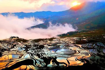 紅河哈尼梯田位于云南南部,遍布于紅河州元陽(yáng)、紅河、金平、綠春四縣,總面積約100萬(wàn)畝,僅元陽(yáng)縣境內(nèi)就有17萬(wàn)畝梯田。元陽(yáng)梯田是哈尼族人1300多年來(lái)生生不息地“雕刻”的山水田園風(fēng)光畫(huà)。2013年(癸巳年)6月22日在第37屆世界遺產(chǎn)大會(huì)上紅河哈尼梯田被成功列入世界遺產(chǎn)名錄,成為中國(guó)第45處世界遺產(chǎn)。